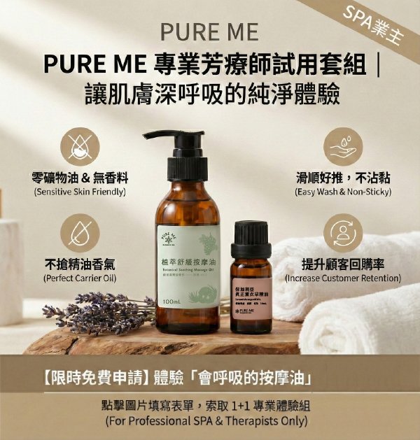 【業者限定.體驗專案】 現在申請「PURE ME 專業試用套組」,親身感受「會呼吸的按摩油」帶來的細膩觸感。提升服務質感,就從換對油開始!